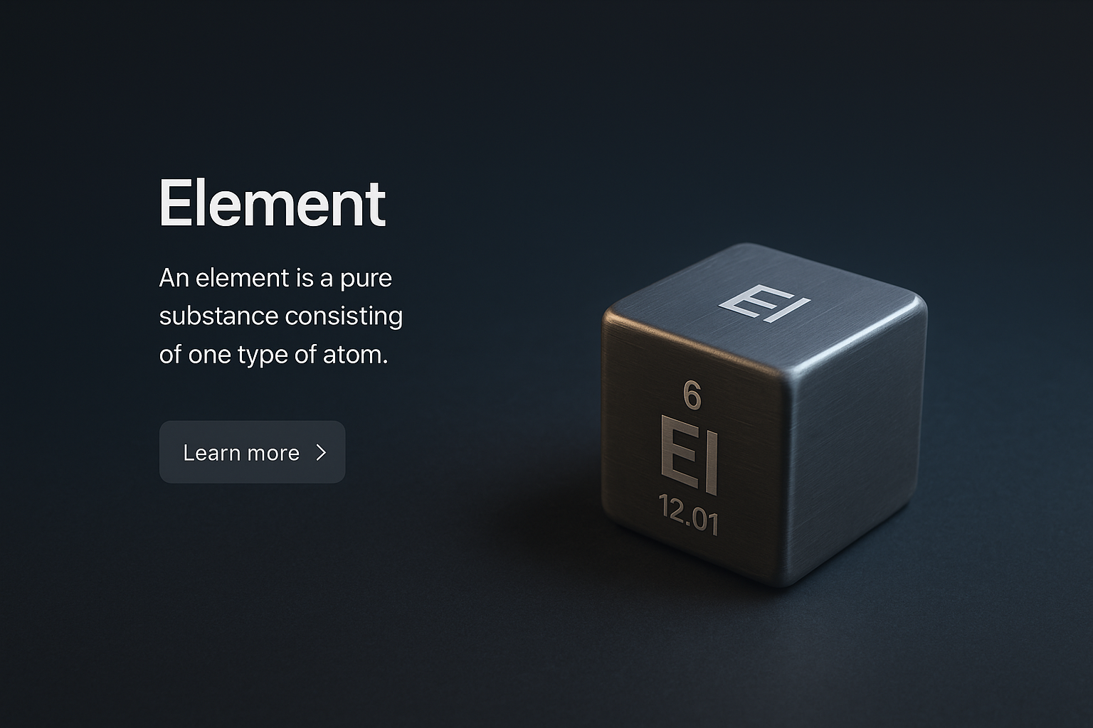 A detailed 3D scene showcasing a metallic element cube on a dark gradient background. The design features concise text and a call-to-action button, emphasizing realism.