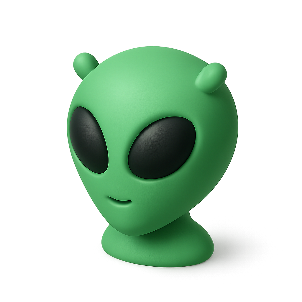 A minimalist 3D alien icon in a three-quarter view, featuring a smooth green surface with large black eyes and a simple, rounded shape. The design has a volumetric feel, set against a soft gradient background.