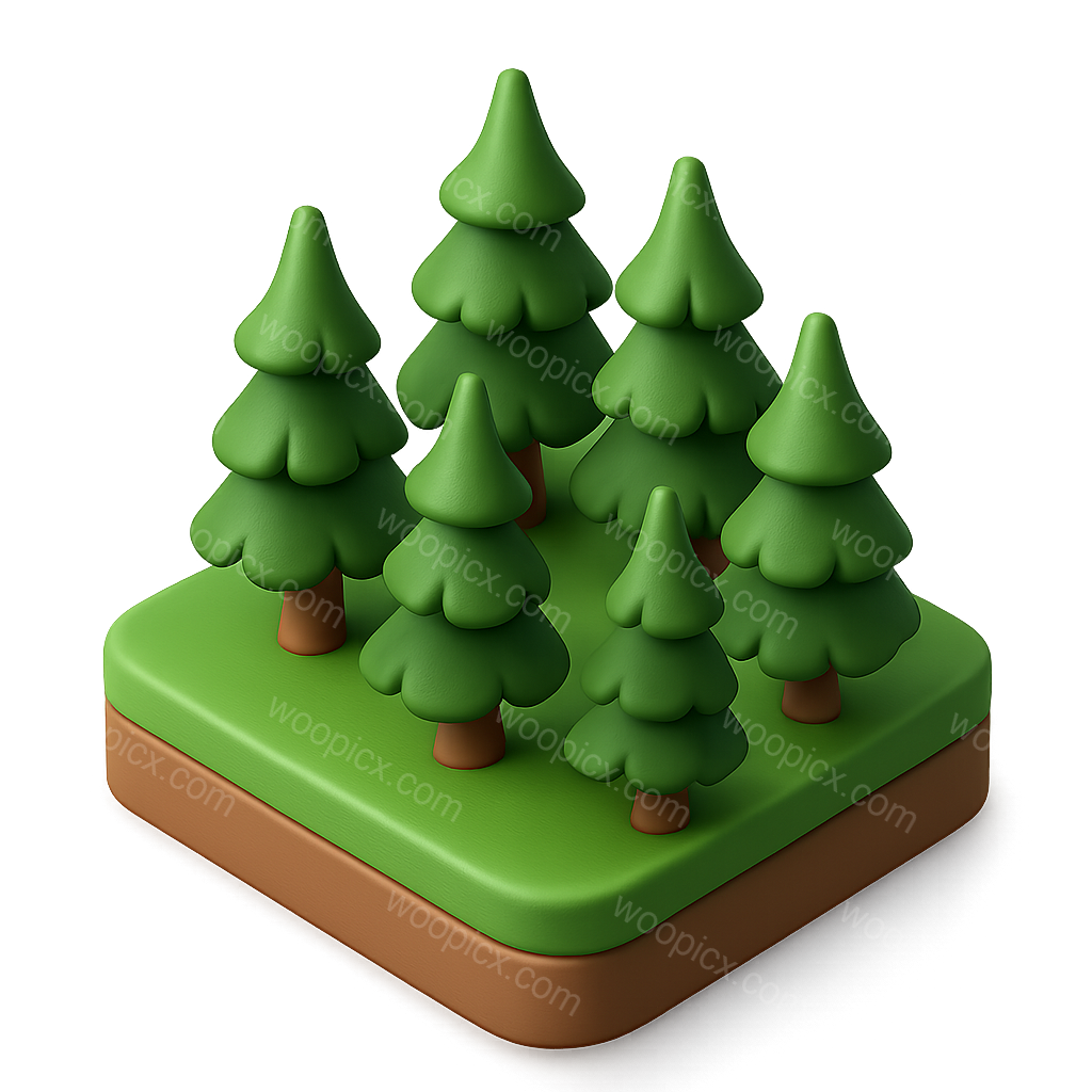 A vibrant, stylized 3D icon showcasing a cluster of conifer trees set on a green base. The design features a three-quarter view with a soft, isometric, and volumetric appearance, perfect for digital use.