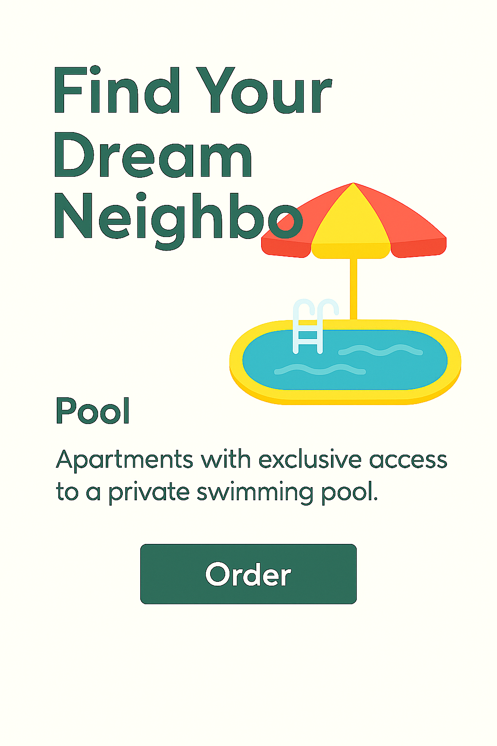 Vibrant promotional graphic showcasing apartment amenities, specifically a private swimming pool, designed to attract potential renters. The modern style and playful colors appeal to a younger audience.