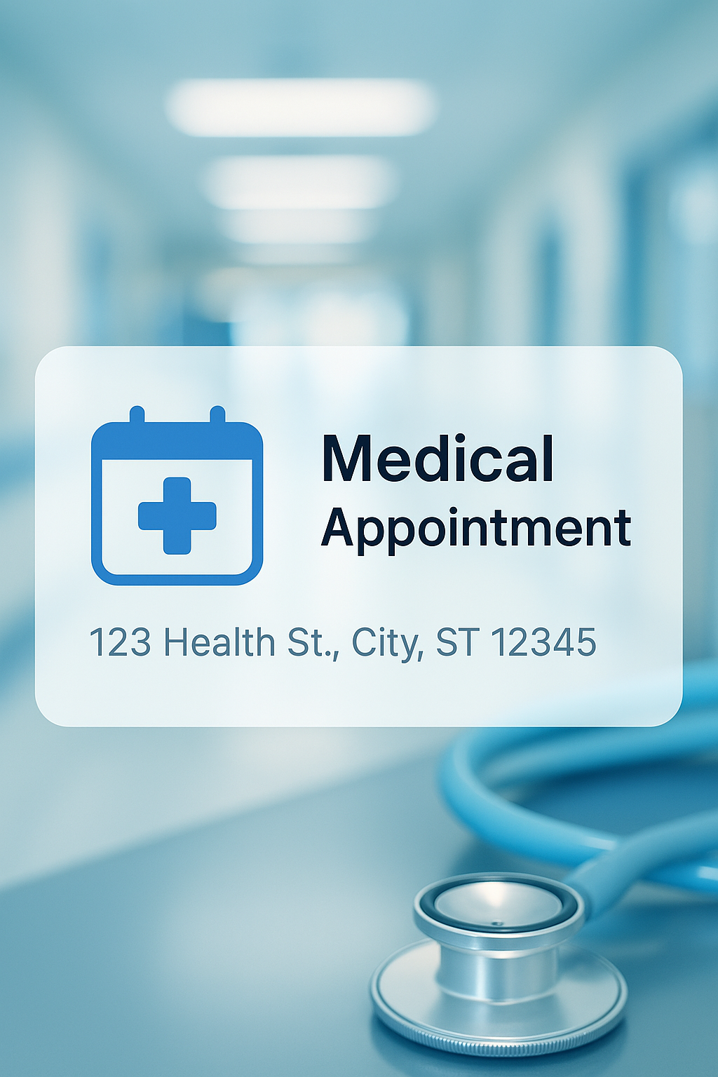 Professional graphic design featuring a medical appointment reminder with a stethoscope, suitable for healthcare communications and patient reminders.