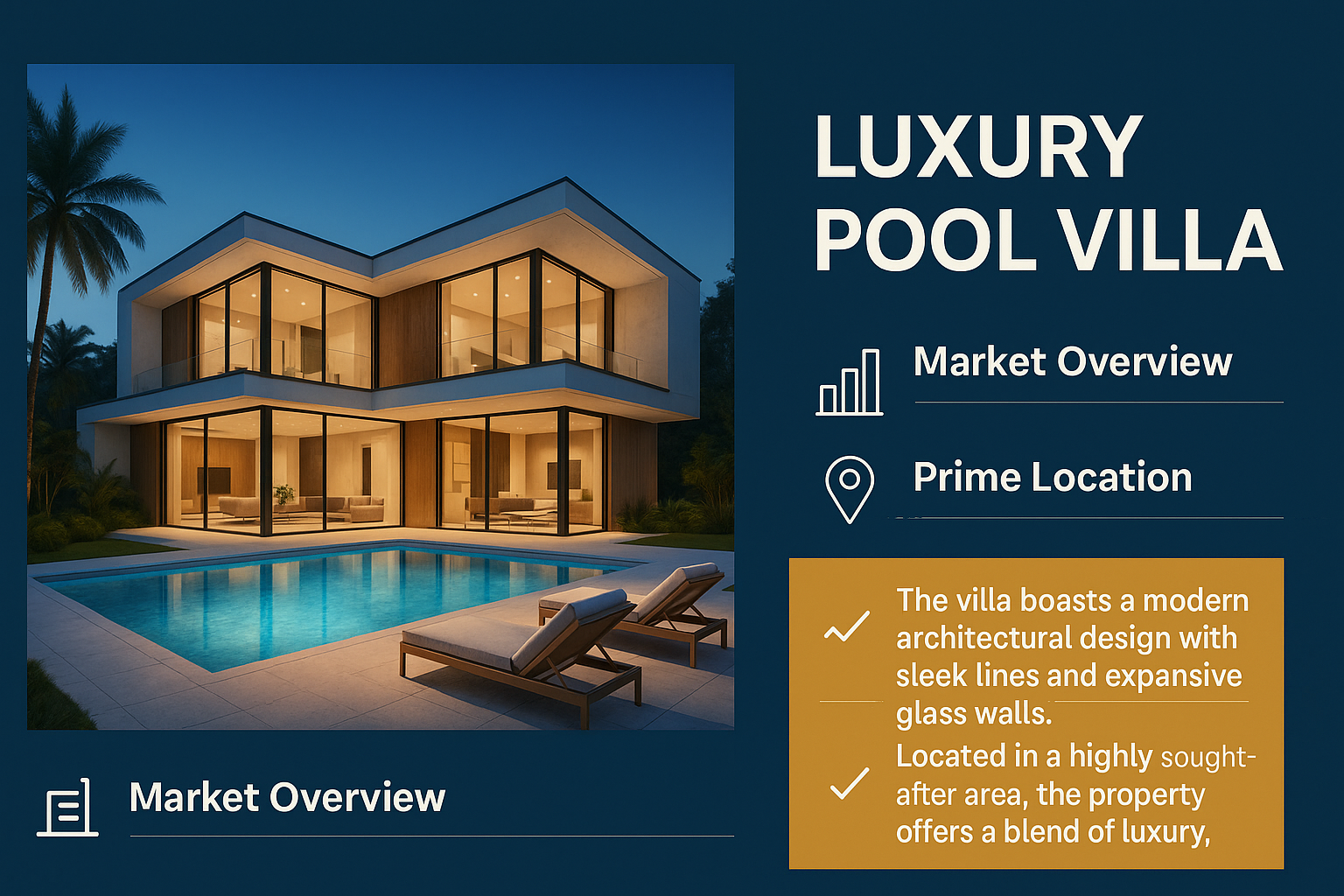 A promotional graphic showcasing a luxury pool villa with modern architecture and expansive glass walls, ideal for real estate marketing and property listings.