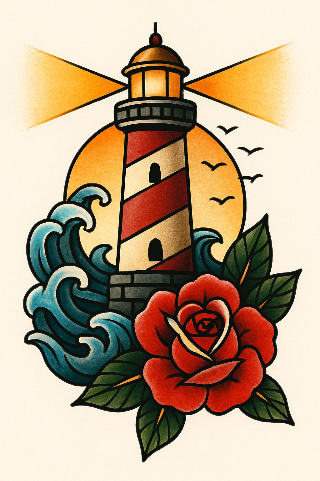 Colorful Tattoo Design Featuring a Lighthouse and Rose