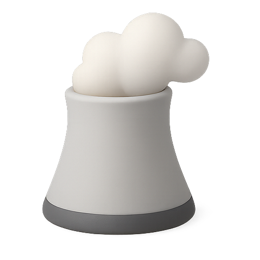 A minimalist design of a nuclear cooling tower emitting stylized steam, suitable for educational content or environmental discussions. The soft, rounded shapes and neutral colors add a modern touch.