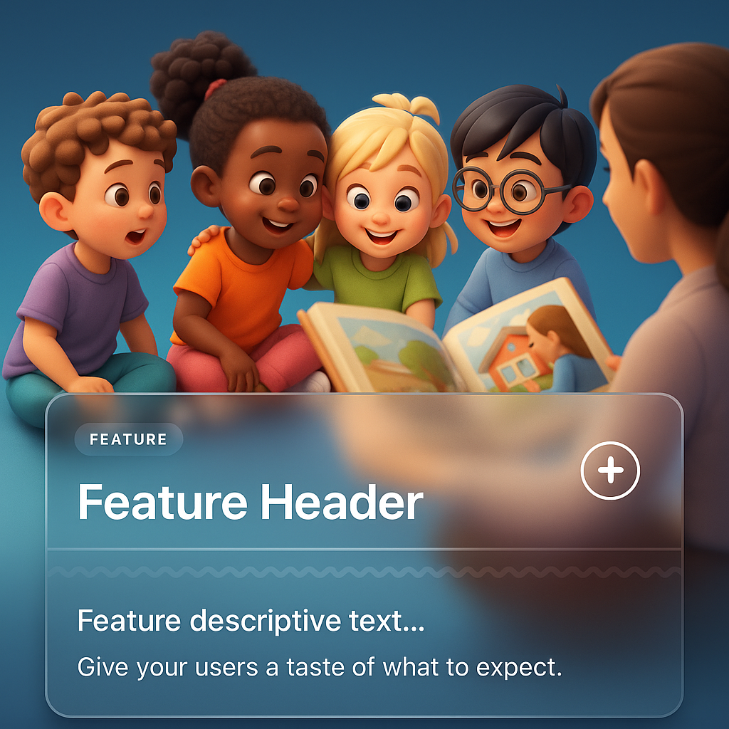 /Collection: /by davooda/Type: PNG/A vibrant 3D illustration showing diverse children enjoying a reading session. They are engaged and smiling while looking at a book. The design includes a transparent feature block with a header and descriptive text.