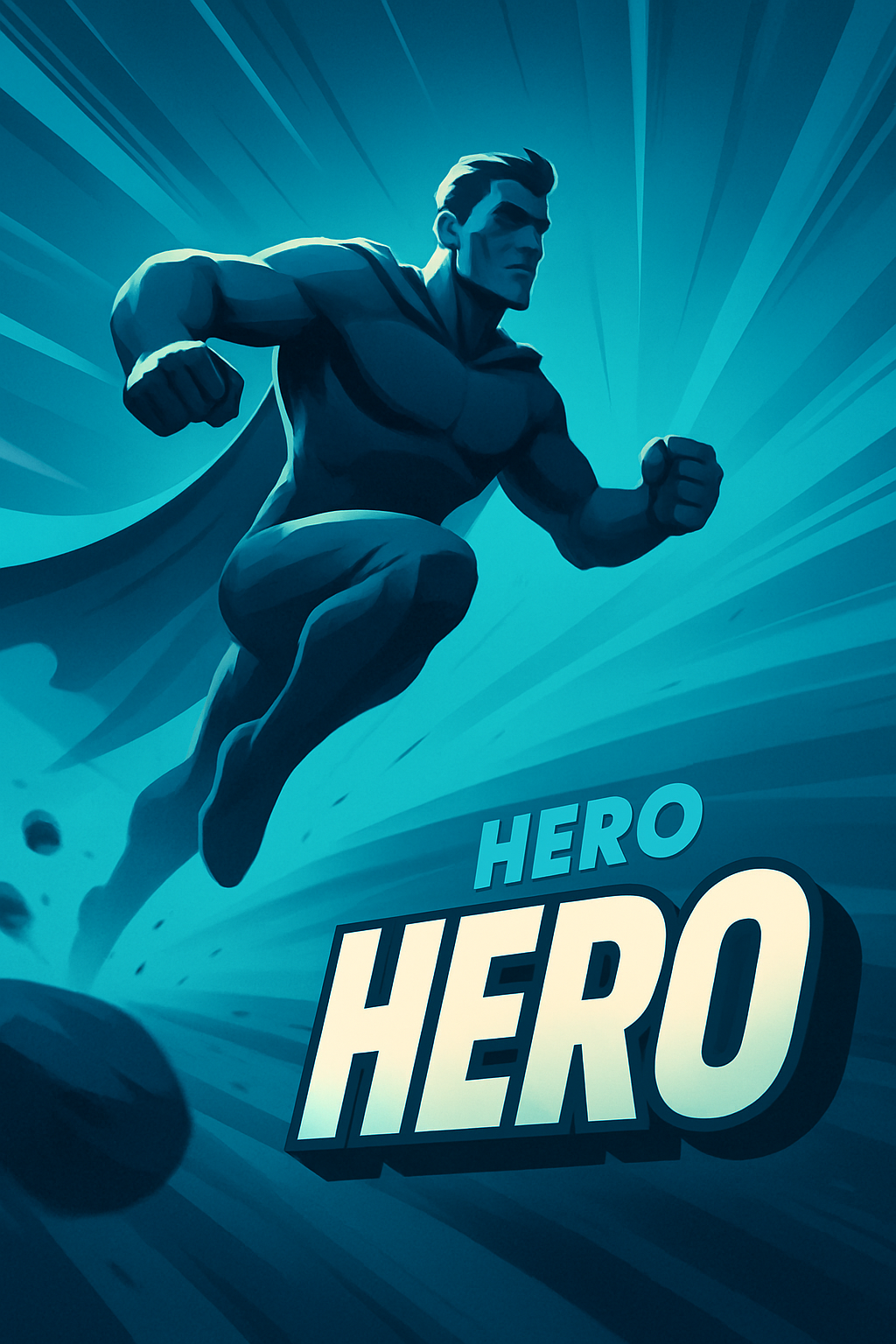 A striking illustration of a hero in motion, featuring dynamic lines radiating from a central point. The color scheme emphasizes blue tones, creating a sense of action and depth.