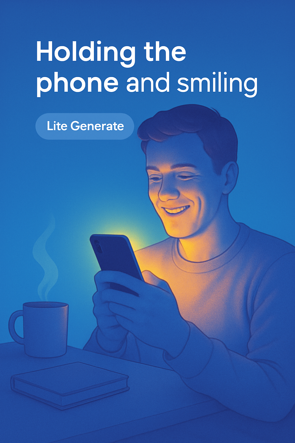 /Collection: /by davooda/Type: PNG/A person smiling while holding a phone emits a warm glow against a blue background. The scene is enhanced by a glowing effect that illuminates the surroundings softly.