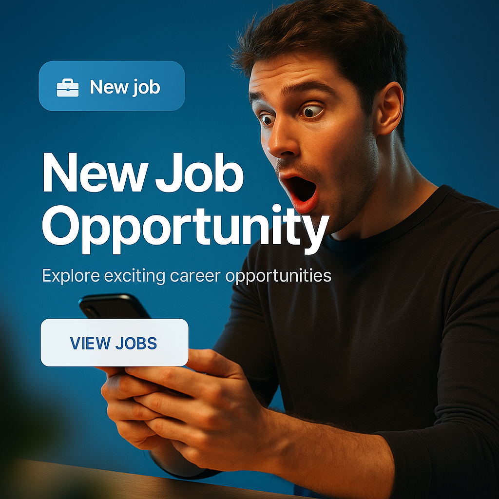 This is a social media post highlighting a new job opportunity. The design features an excited individual using a smartphone, appealing to job seekers.