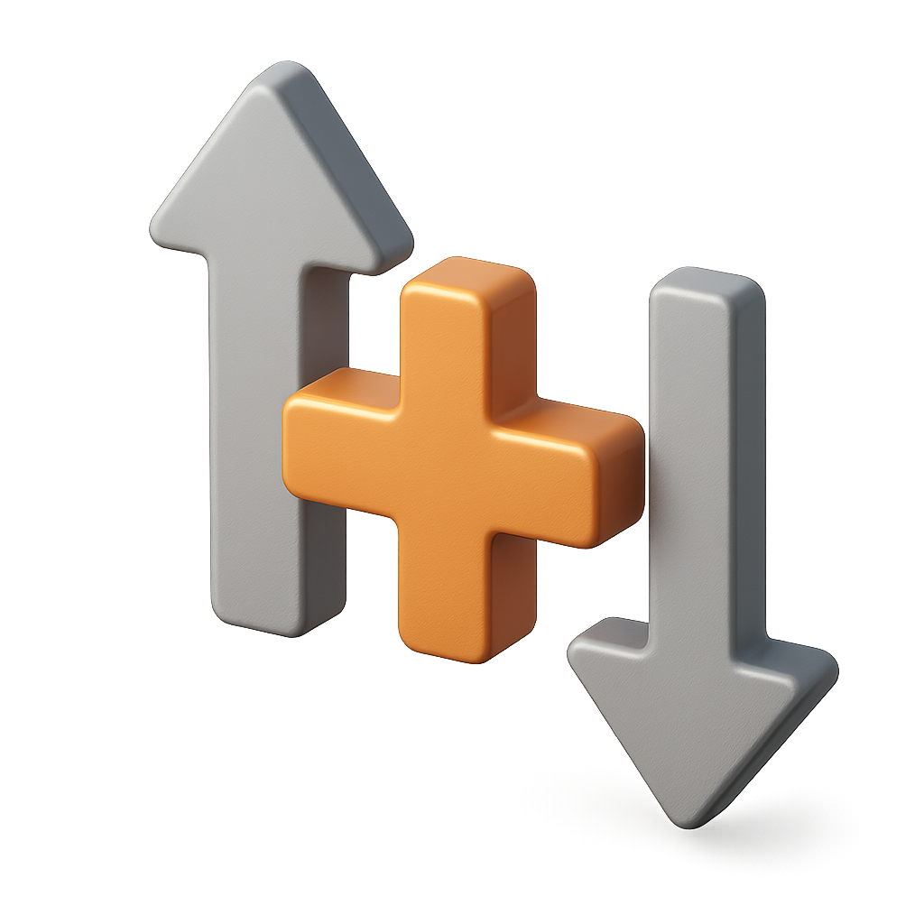 A visually appealing 3D icon featuring arrows pointing up and down, with a central orange plus sign. The design showcases a three-quarter view and an isometric perspective.