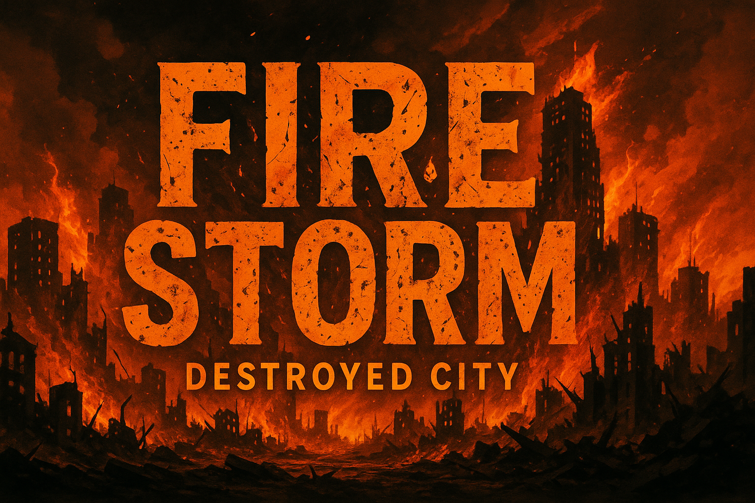 Dramatic Artwork Depicting a Firestorm Over a Destroyed City