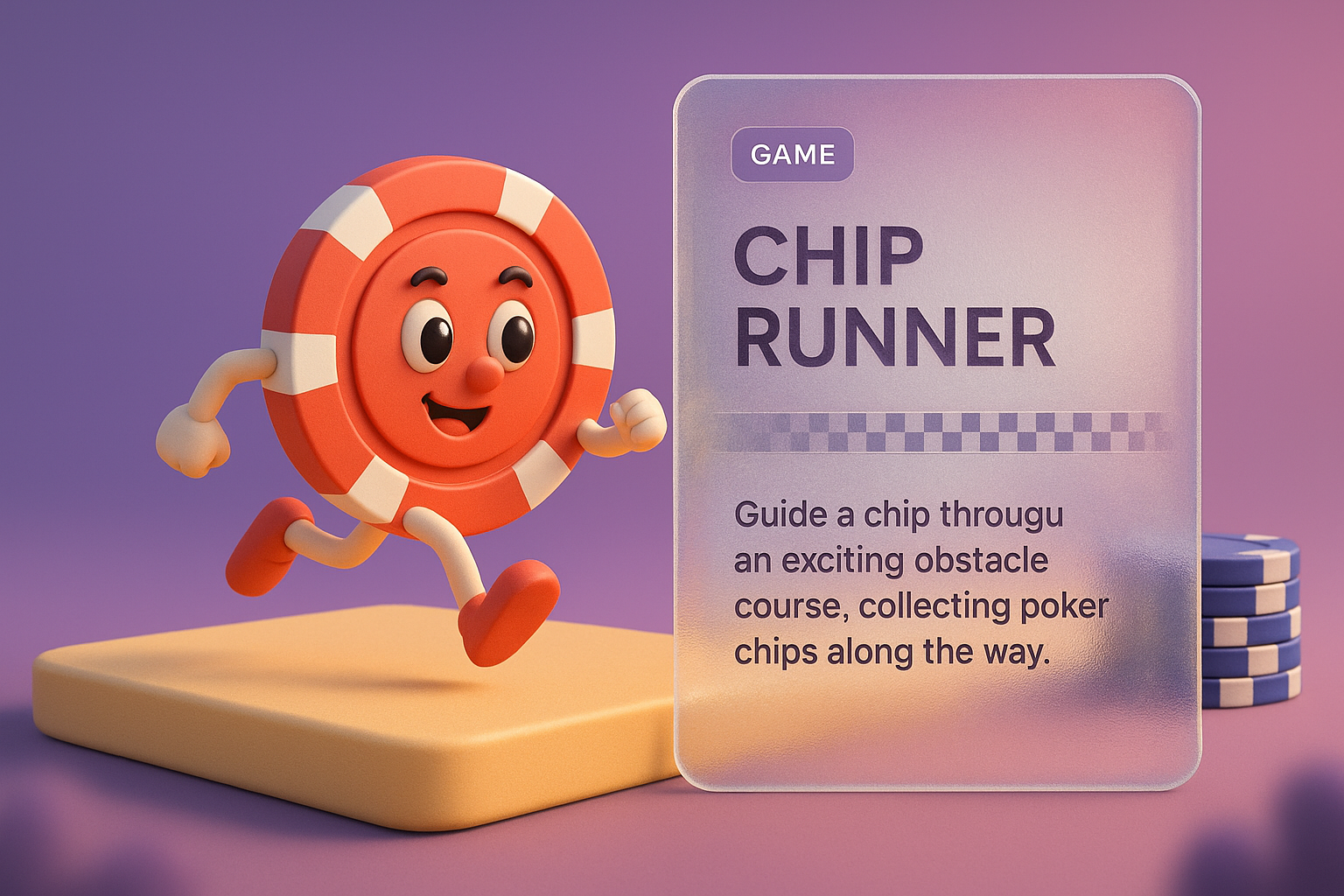 /Collection: /by davooda/Type: PNG/A vibrant 3D illustration featuring a playful chip character running towards an obstacle course. The design includes a transparent block with game details and a smooth gradient background.