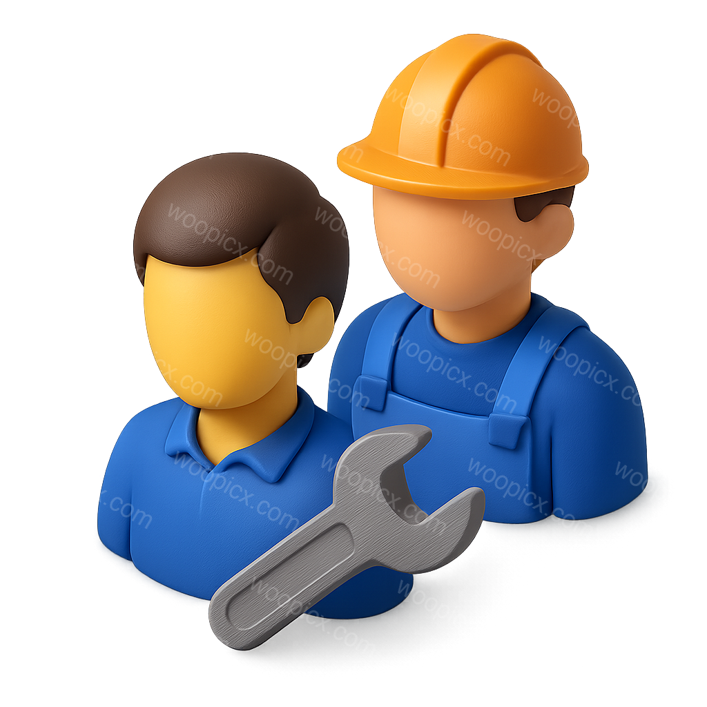 /Premium/Collection: /by davooda/Type: PNG/This 3D icon features two stylized characters representing apprenticeship in trade. One wears a hard hat and overalls, while the other dons a casual shirt, holding a wrench, all set against a gradient background.