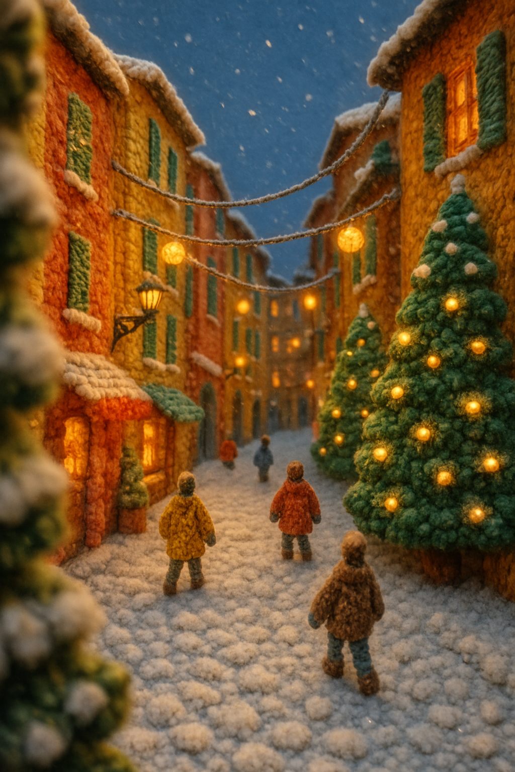 /Collection: /by davooda/Type: PNG/A charming 3D scene depicting Vieux Nice, featuring streets made of wool with tiny figures strolling under festive lights. Soft snowfall adds to the holiday vibe.