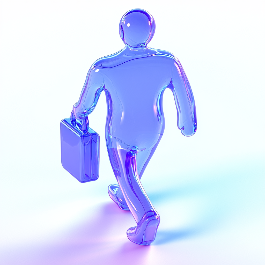 /Collection: /by davooda/Type: PNG/A modern, stylized glass figure representing a businessman walking while holding a briefcase. The use of translucent materials and vibrant colors creates a contemporary art feel, suitable for corporate branding or motivational content.