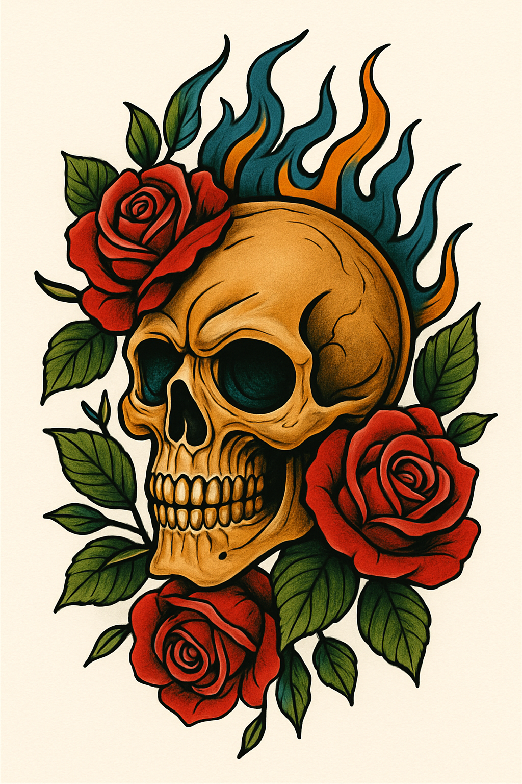 Vibrant illustration featuring a skull with flames and roses, combining elements of traditional and modern tattoo art, suitable for merchandise or art prints.