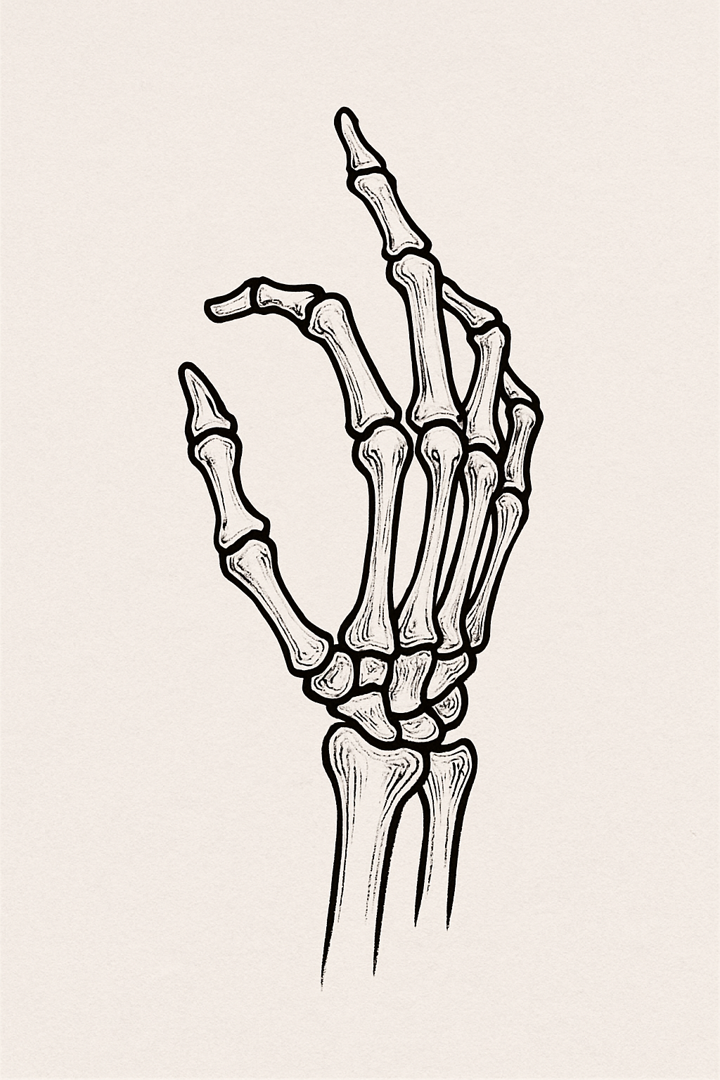 This is a detailed illustration of a skeletal hand making an 'okay' gesture. It features a vintage and artistic style, suitable for educational or artistic purposes.