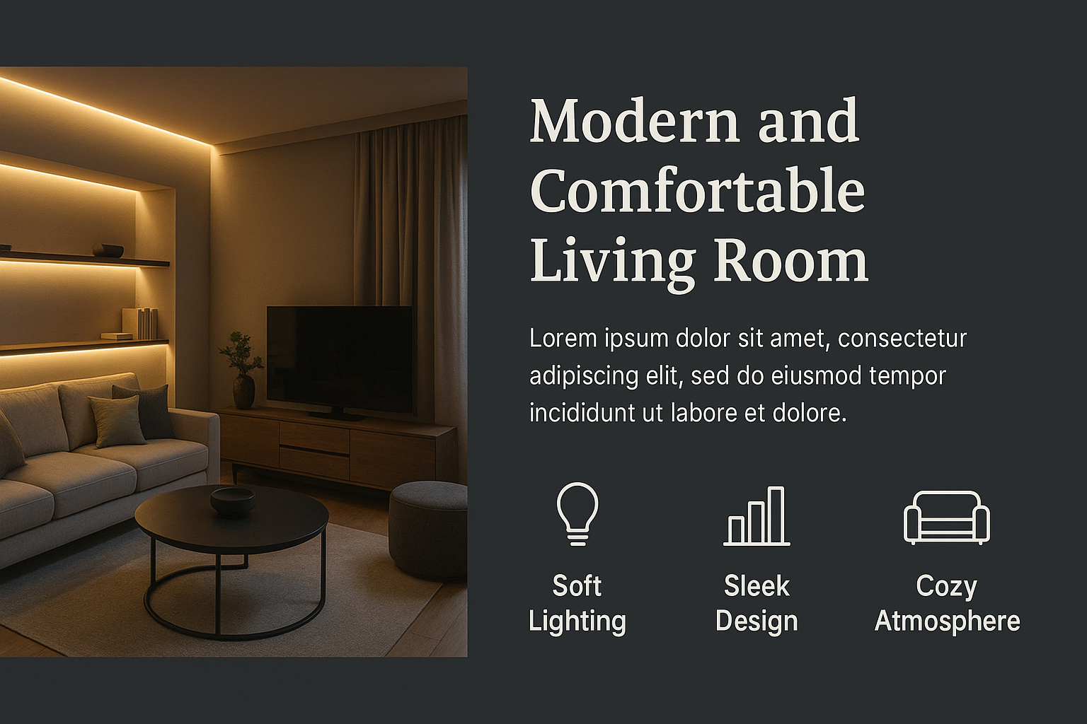Stylish interior image of a modern living room featuring soft lighting and sleek design elements, ideal for home decor inspiration and real estate marketing.