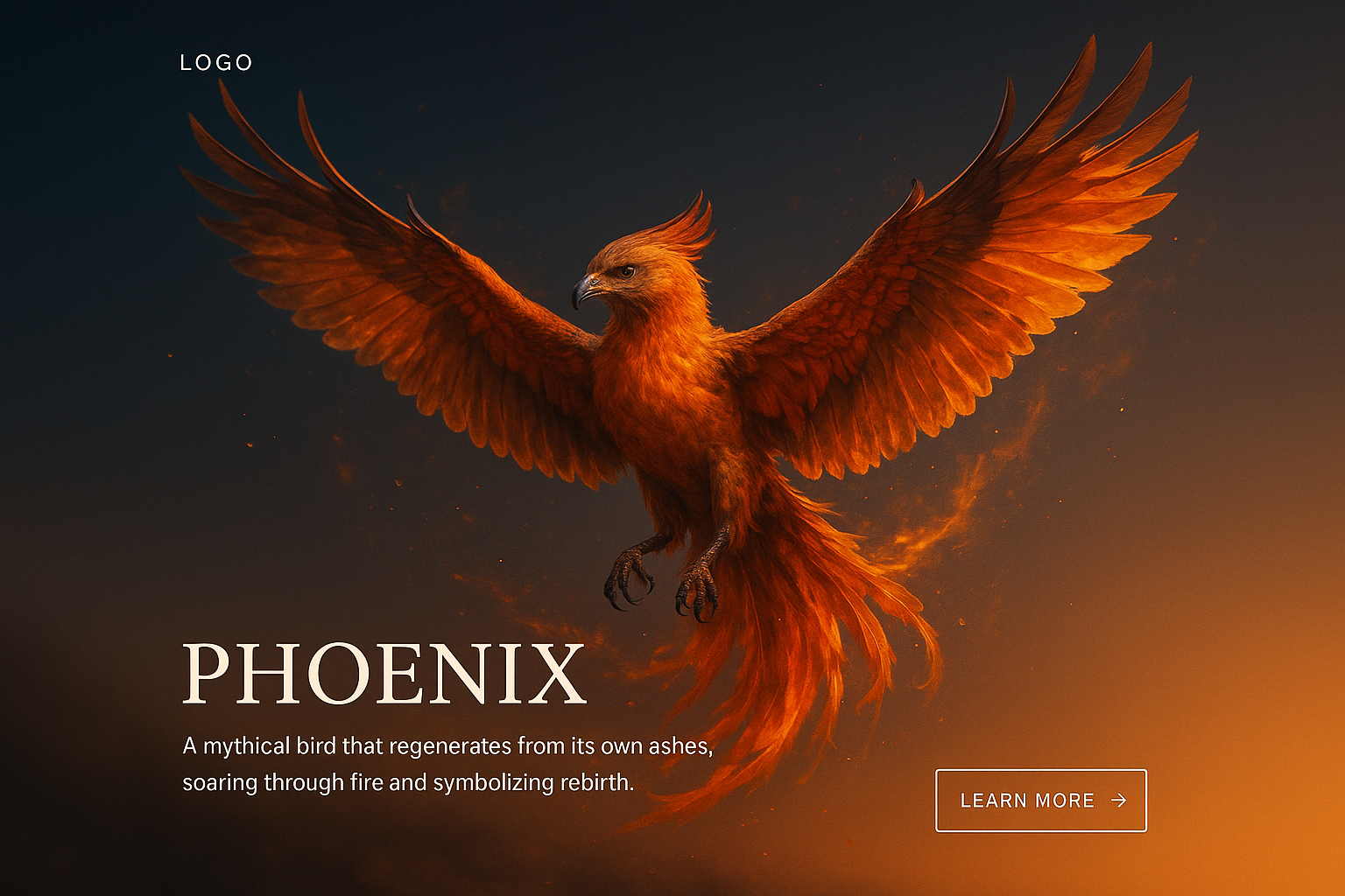 A stunning phoenix illustration with vibrant orange feathers, soaring through a gradient background. Features a clear logo, title, and a call-to-action button.