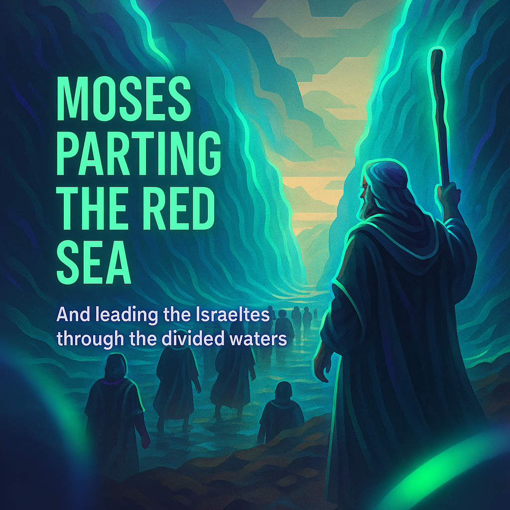/Collection: /by davooda/Type: PNG/Vivid digital artwork depicting Moses parting the Red Sea, showcasing a dramatic scene with stylized figures and vibrant colors, ideal for educational or religious contexts.