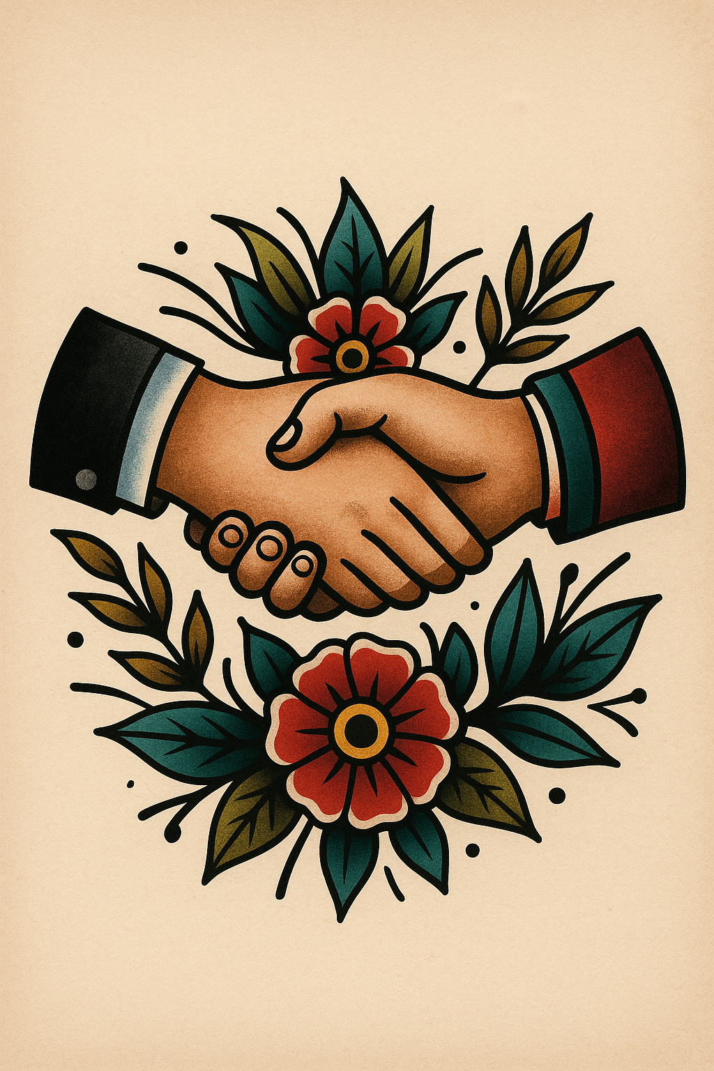 This image features a vintage-style illustration of a handshake surrounded by floral elements. It's ideal for themes of cooperation and agreement.