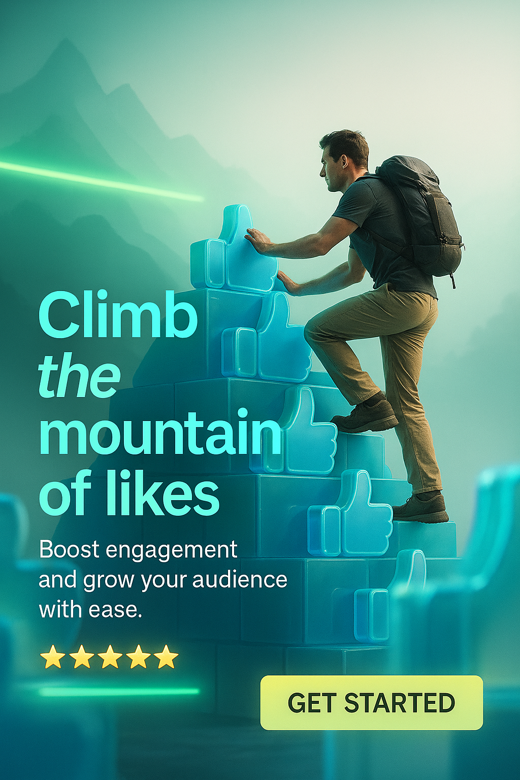 /Collection: /by davooda/Type: PNG/A visually appealing promotional graphic emphasizing social media engagement, featuring a person climbing a stylized mountain of thumbs-up icons, ideal for digital marketing campaigns.