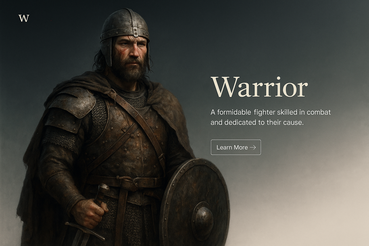 A striking web design featuring a warrior illustration, with a gradient background transitioning from dark to white. Includes clear typography and a call-to-action button.
