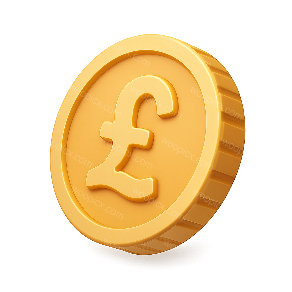 /Premium/Collection: /by davooda/Type: PNG/A vibrant 3D rendering of a pound coin, showcasing a raised pound symbol against a glossy surface. The coin is depicted in a three-quarter view, emphasizing its volumetric shape and isometric style.