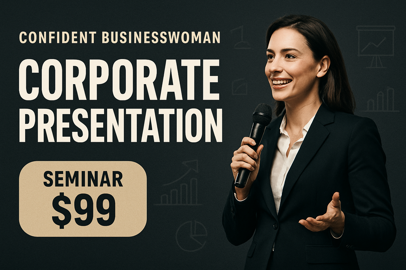 /Collection: /by davooda/Type: PNG/A confident businesswoman delivers a corporate presentation at a seminar. The image reflects her leadership in a dynamic, modern style with bold typography and a professional background.
