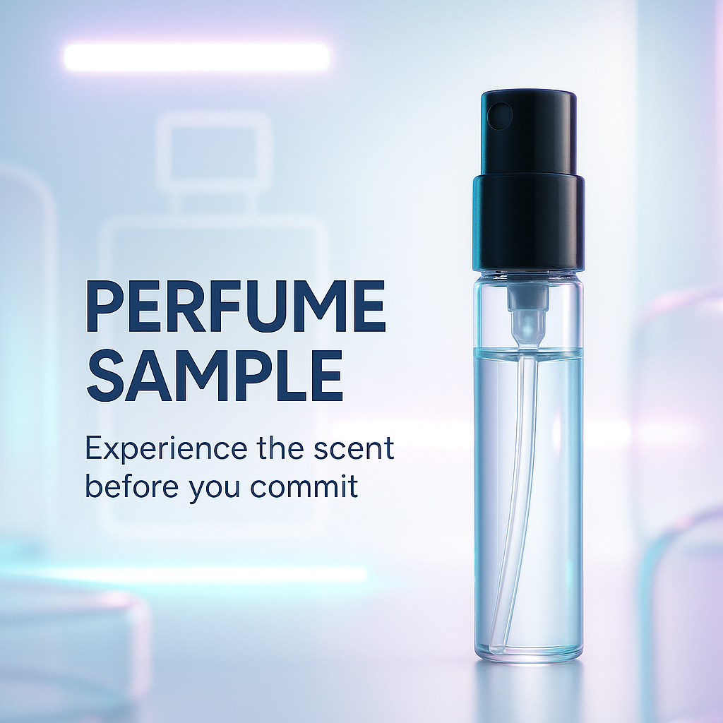 A stylish product image featuring a perfume sample bottle against a softly lit background, designed for marketing fragrance products. Ideal for e-commerce and promotional use.