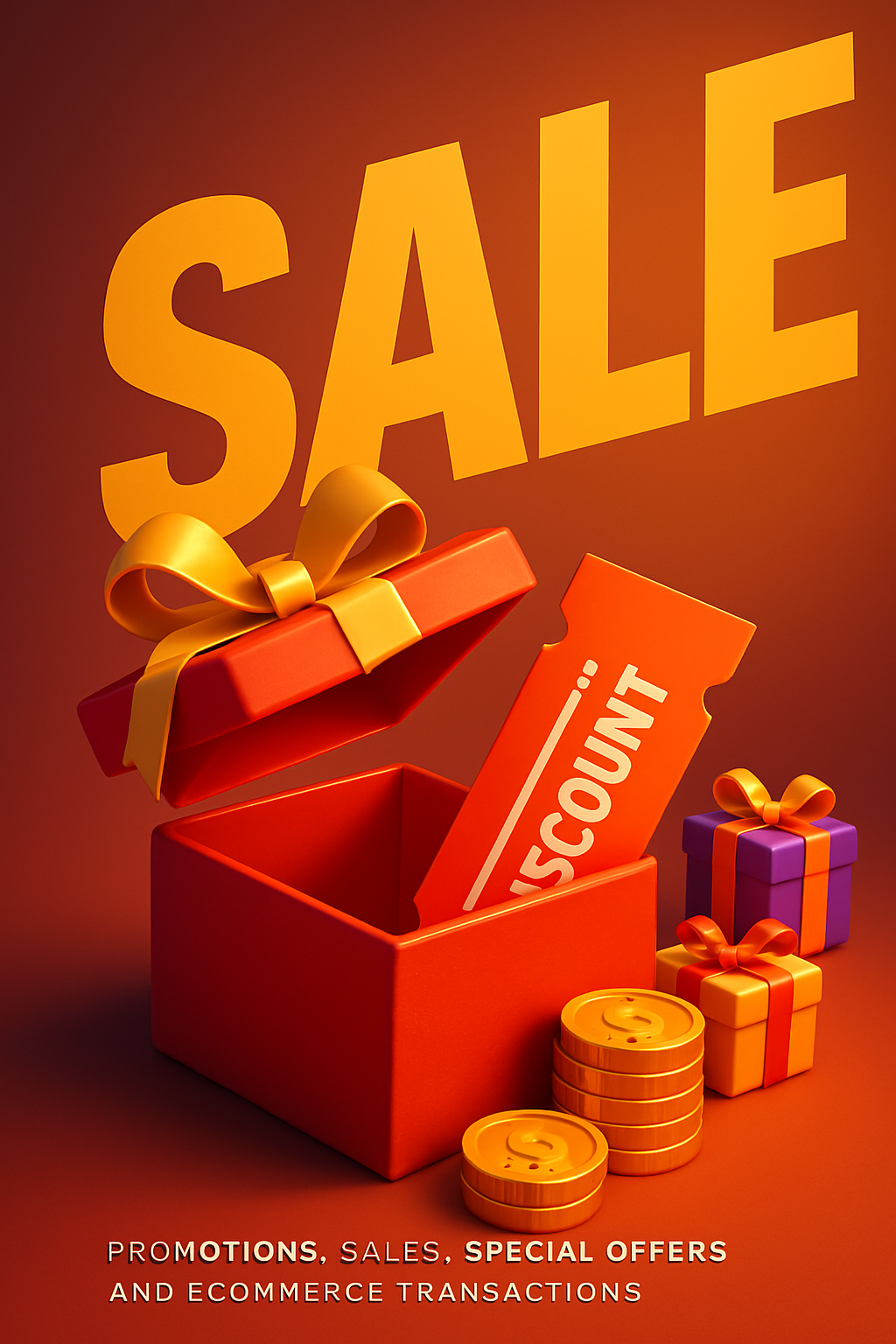 A vibrant red gift box with a yellow ribbon, filled with a discount voucher, coins, and small gifts. The bold 'SALE' headline enhances the promotional theme.