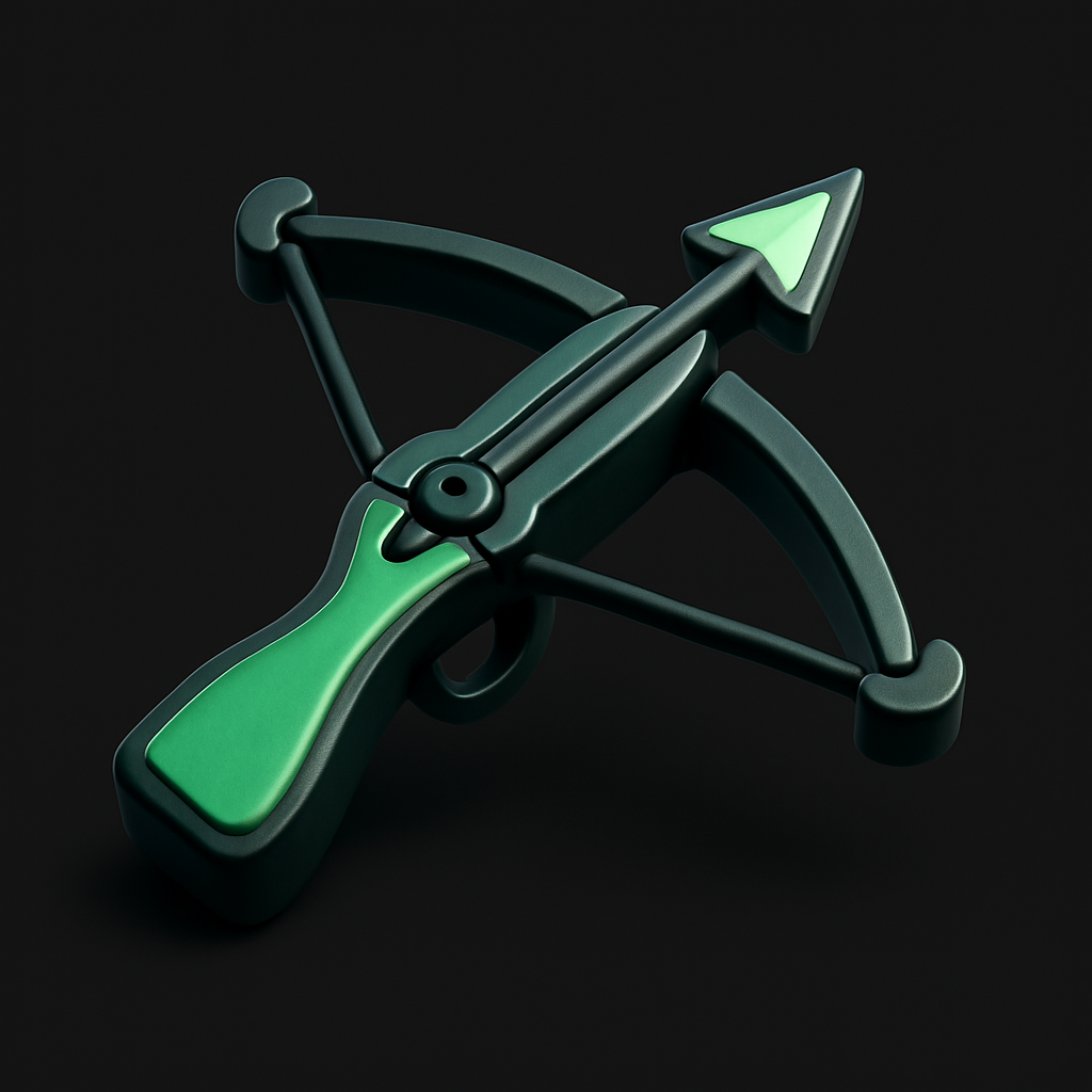 A meticulously crafted 3D crossbow icon in green and black colors, showcasing high detail from a three-quarter view against a black background.
