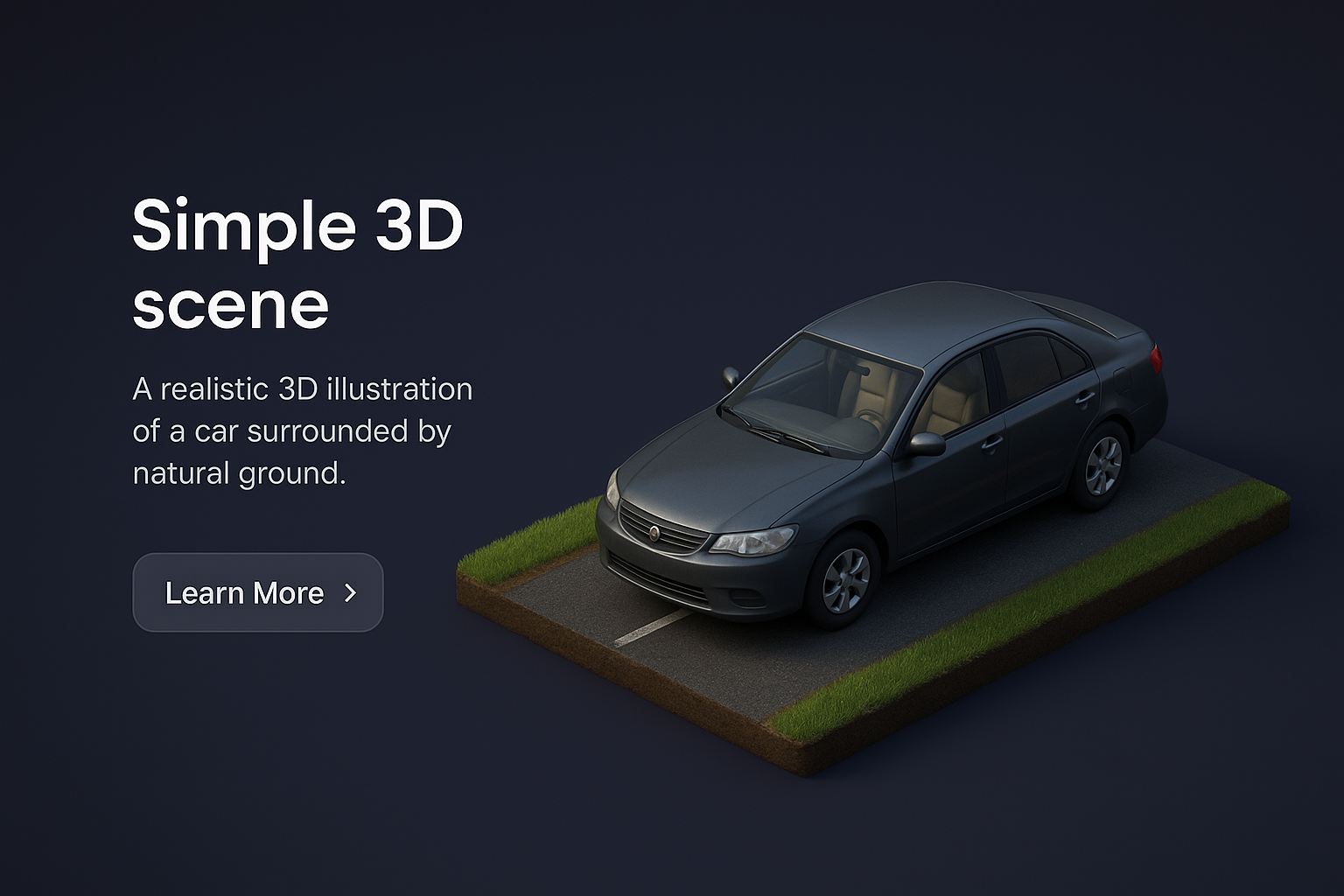 A detailed 3D illustration of a car situated on a simple road, surrounded by natural elements. The scene features a dark gradient background, enhancing the focus on the vehicle.