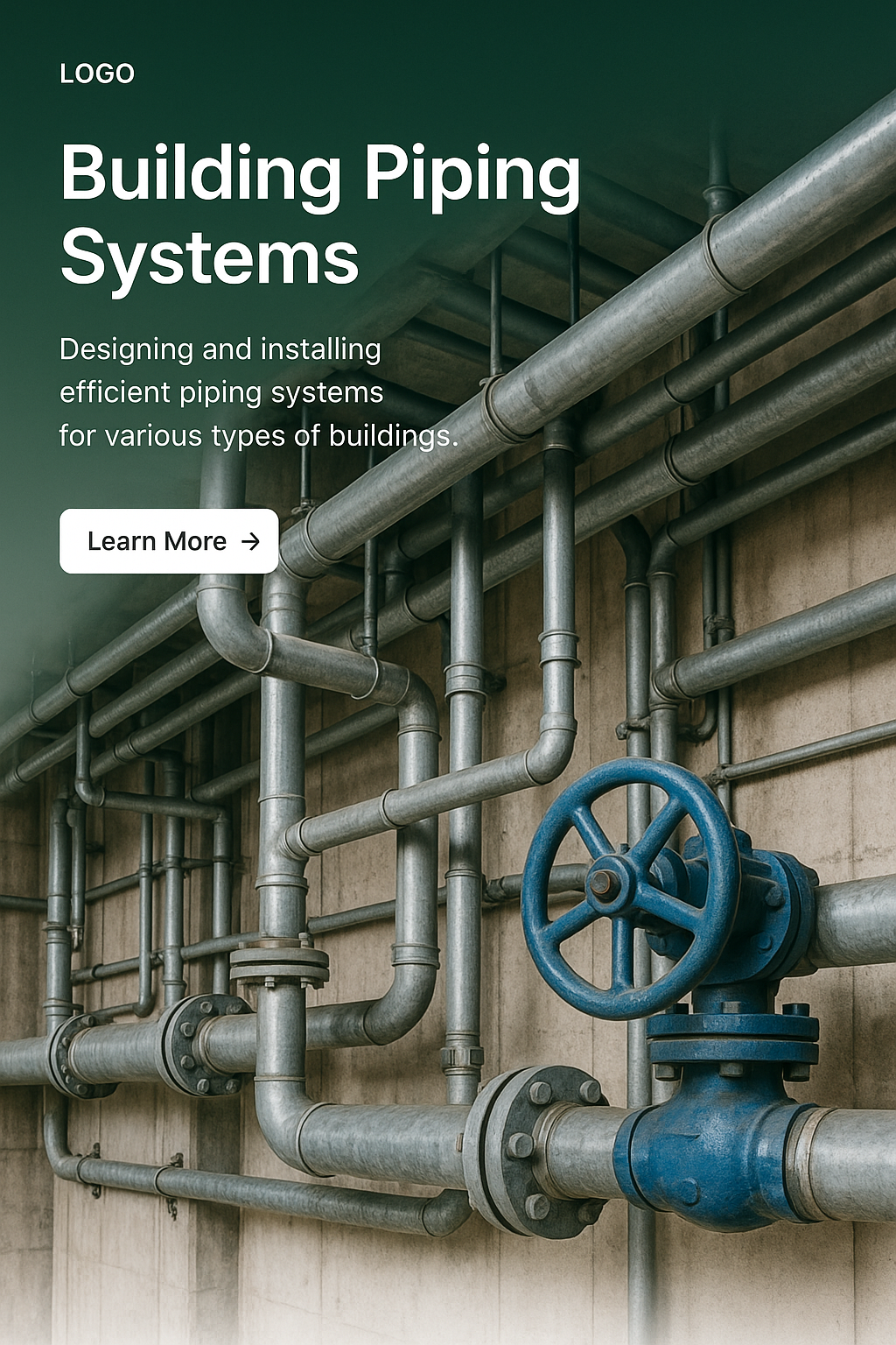 An illustration showcasing piping systems with a focus on design and installation for various buildings. Features a logo and a call-to-action button.