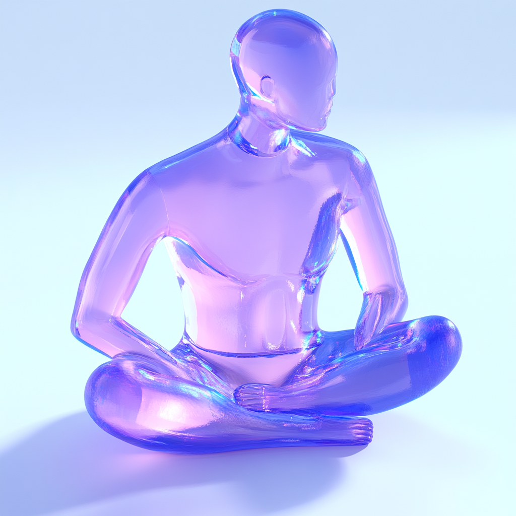 A stylized translucent figurine depicting a seated figure in a meditative pose, showcasing modern design with a calming color palette, ideal for wellness or art-focused contexts.