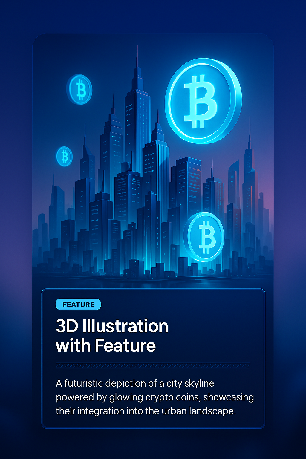 A vibrant 3D illustration of a futuristic city skyline featuring glowing crypto coins. The design integrates text blocks and graphics, showcasing technological innovation.