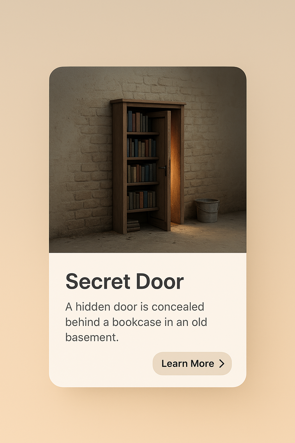 A detailed 3D scene depicting a secret door hidden behind a bookcase in an old basement. The composition is zoomed out, showcasing the environment subtly.