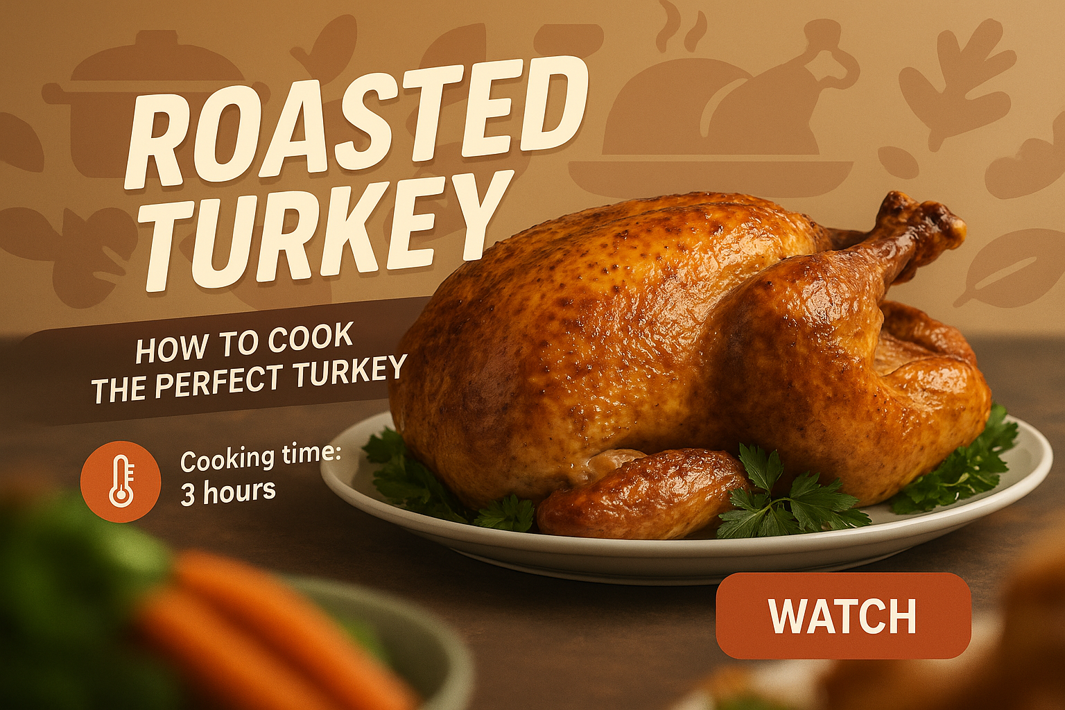 A visually appealing culinary graphic featuring a perfectly roasted turkey, ideal for a cooking tutorial or recipe guide with a warm color palette and inviting design.