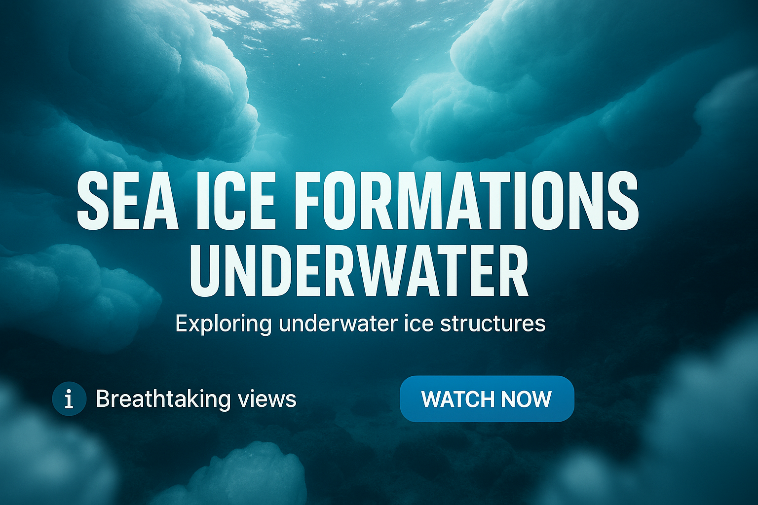 Engaging promotional graphic showcasing underwater sea ice formations with a serene color palette, designed to attract viewers to explore breathtaking visuals. Ideal for nature documentaries or educational content.