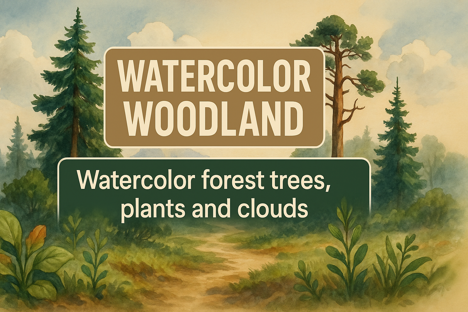Beautiful watercolor illustration showcasing a serene woodland scene with trees, plants, and clouds. Ideal for nature-themed projects or decor.
