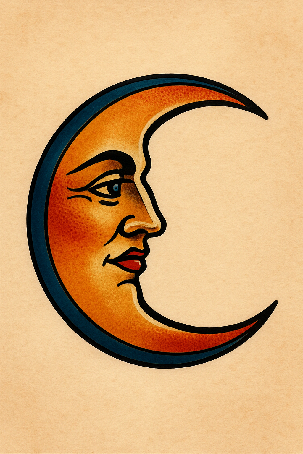 /Collection: /by davooda/Type: PNG/This is a stylized illustration of a crescent moon featuring a human face. It employs a vintage aesthetic, suitable for decorative or thematic use in art and design projects.