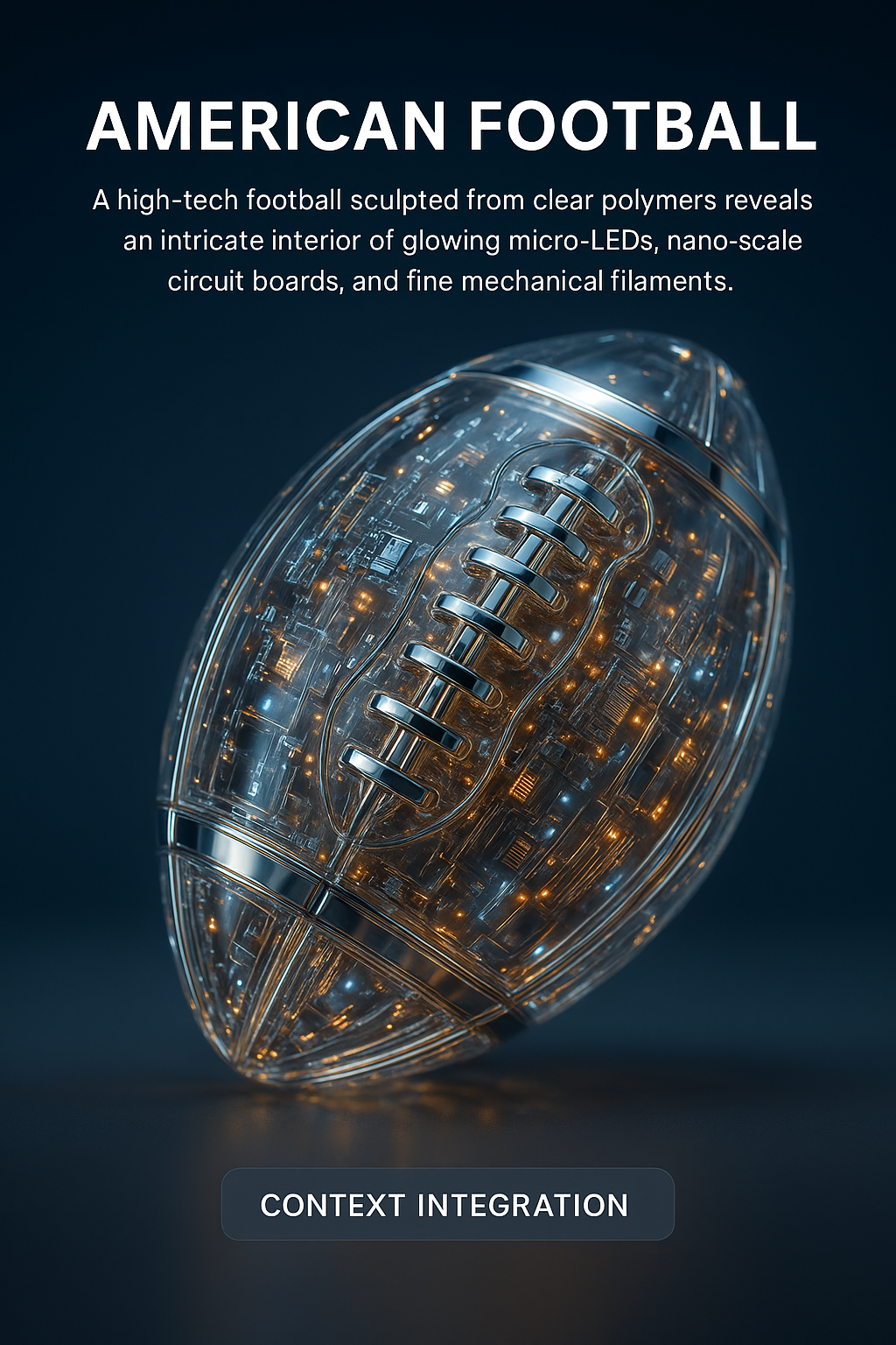 /Collection: /by davooda/Type: PNG/This image features a hyperrealistic American football crafted from clear, glass-like polymers. It showcases a stunning interior with glowing micro-LEDs and intricate circuit boards, all illuminated by stylish soft lighting.