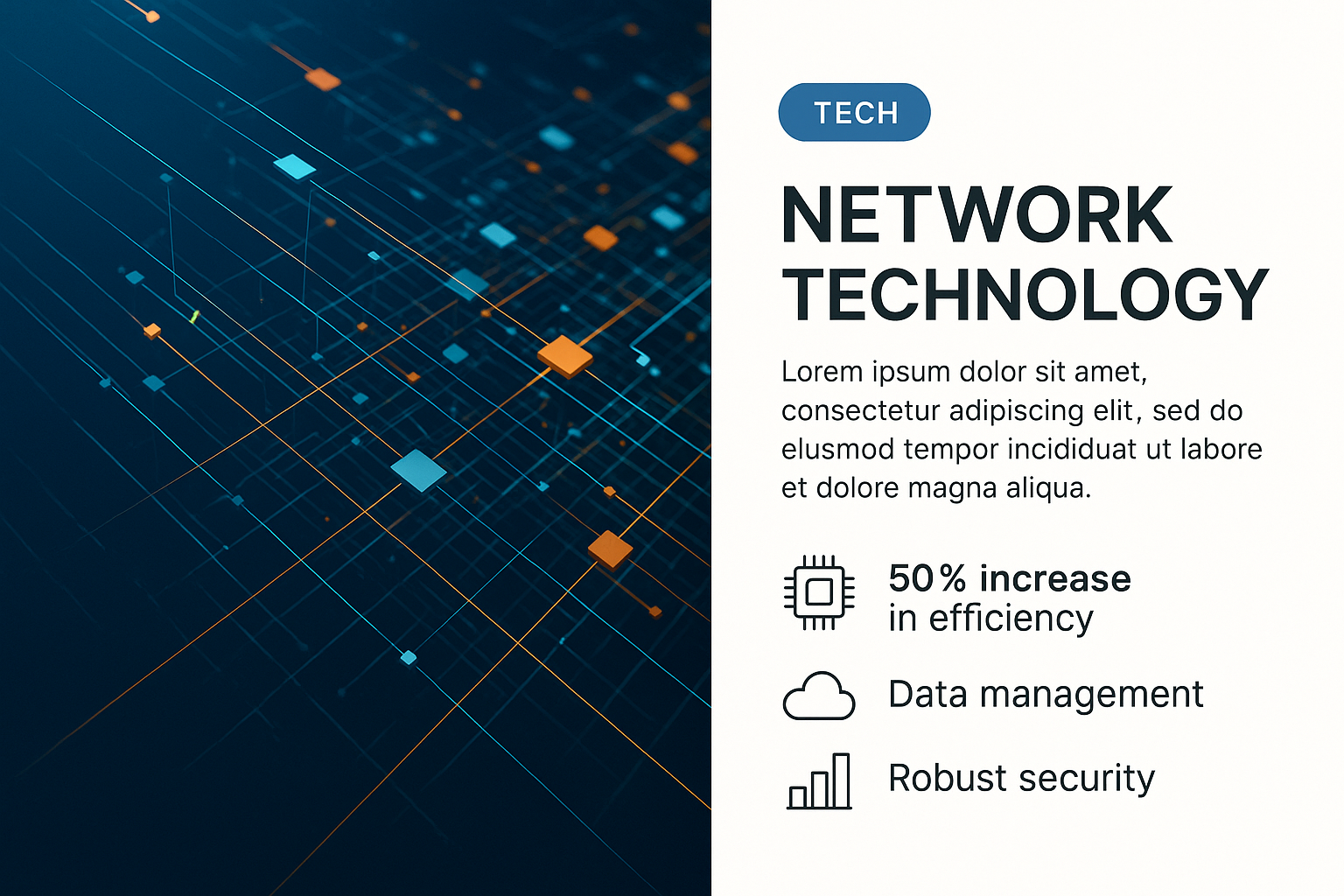 /Collection: /by davooda/Type: PNG/A sleek infographic showcasing network technology concepts with graphical elements representing data flow and management, ideal for tech presentations.