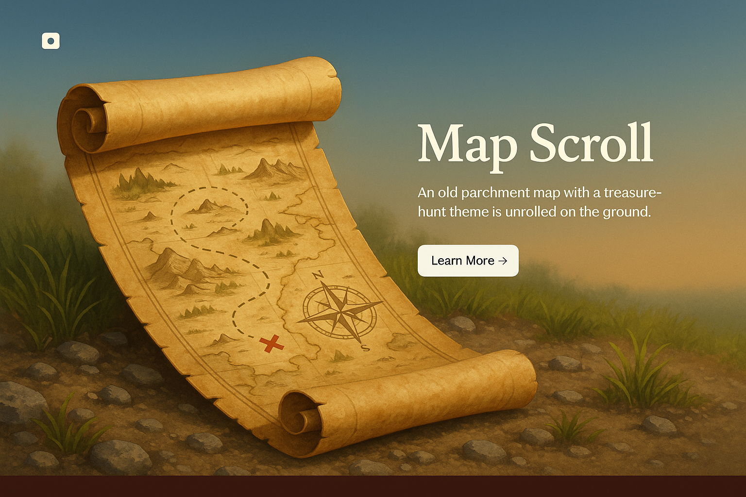 A realistic illustration of an old parchment map scroll with a treasure-hunt theme. The design features intricate details, including mountains and a compass.