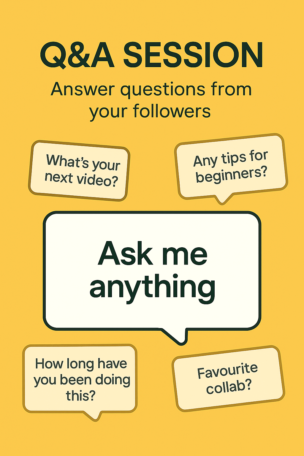 Colorful graphic designed for social media, inviting followers to engage in a Q&A session with visually appealing speech bubbles and a friendly tone. Ideal for content creators to foster interaction.