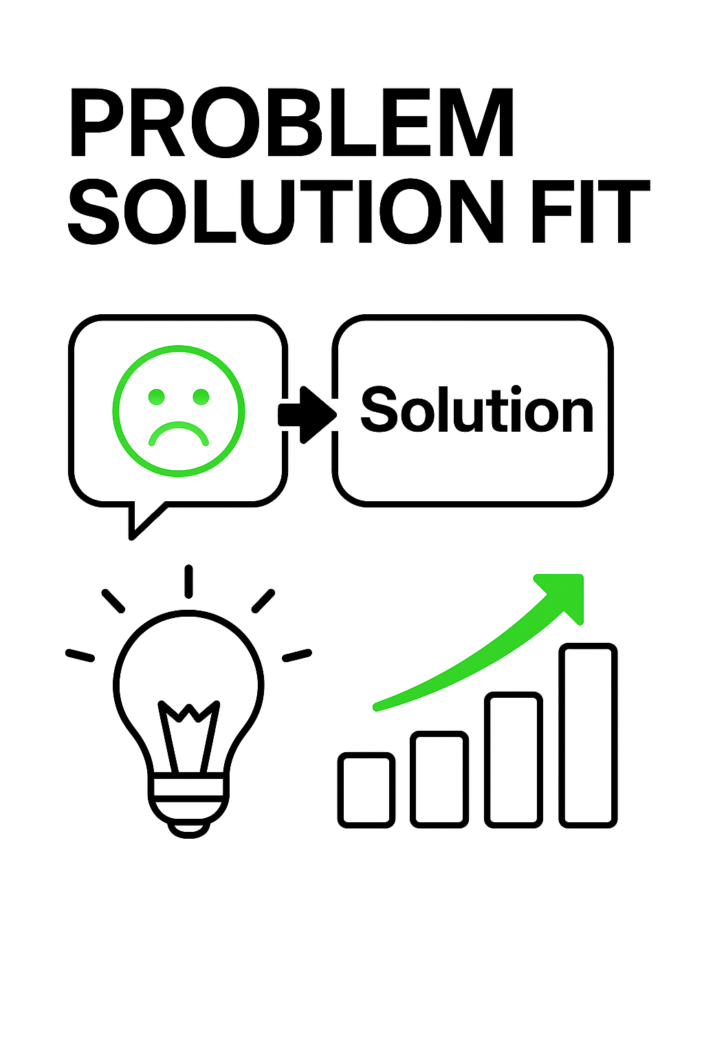 Simplistic infographic illustrating the concept of problem-solution fit using icons and minimal text, ideal for presentations or educational materials.
