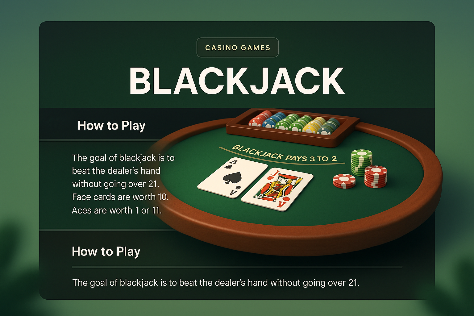 /Collection: /by davooda/Type: PNG/A visually engaging 3D illustration of a blackjack table featuring game instructions. The design includes a gradient background, vibrant chips, and clear text blocks for easy readability.
