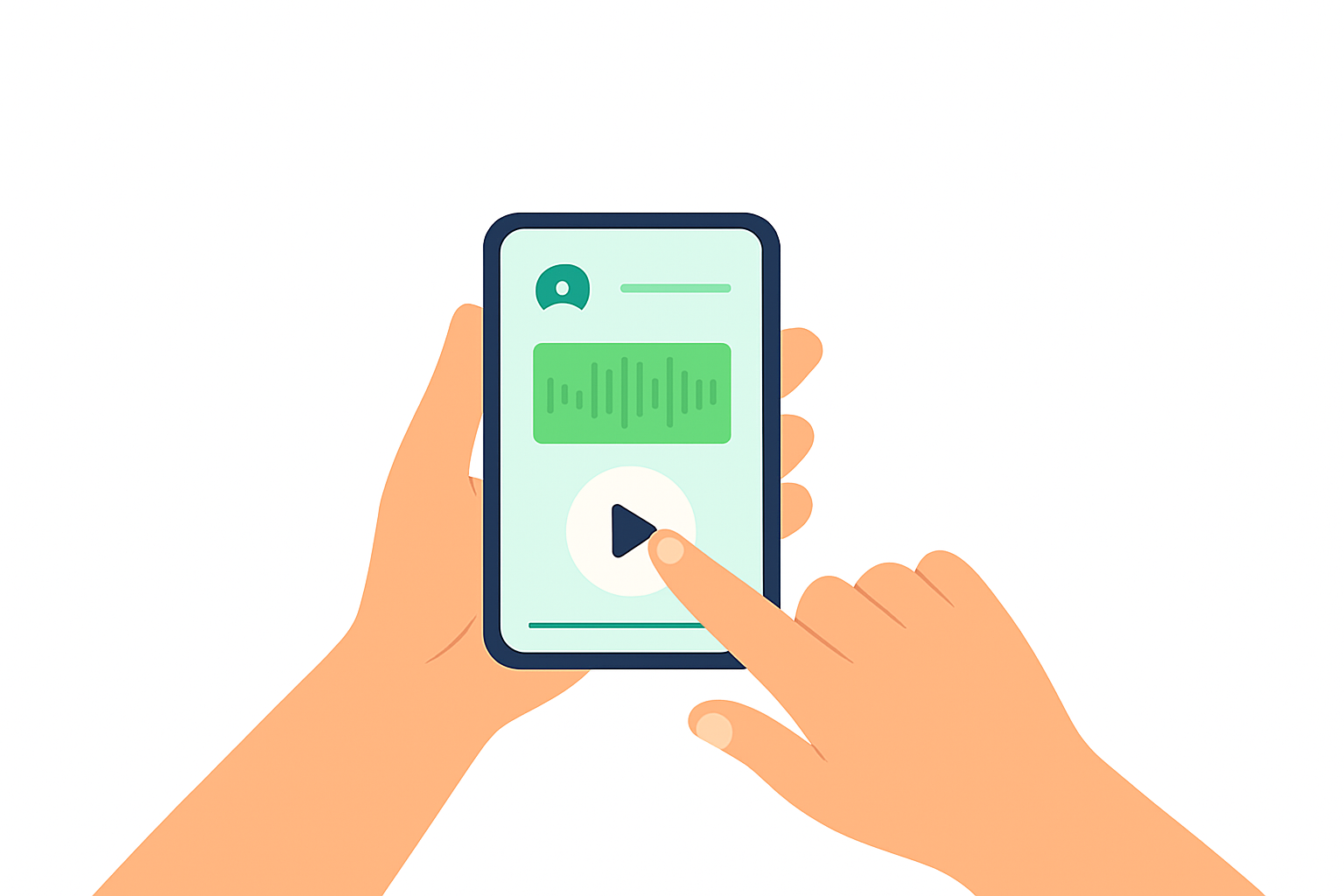 Vector graphic depicting a hand interacting with a smartphone displaying a voice message interface, suitable for digital communication themes.