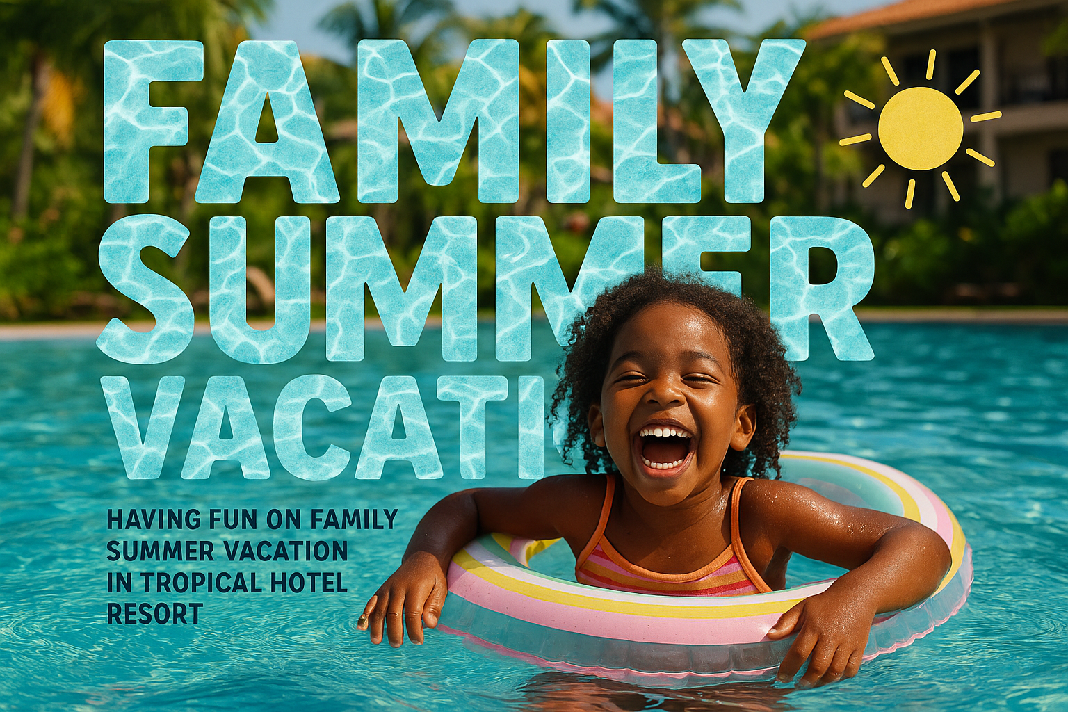A vibrant promotional image showcasing a child enjoying a summer vacation in a pool, perfect for travel or family-oriented marketing materials.
