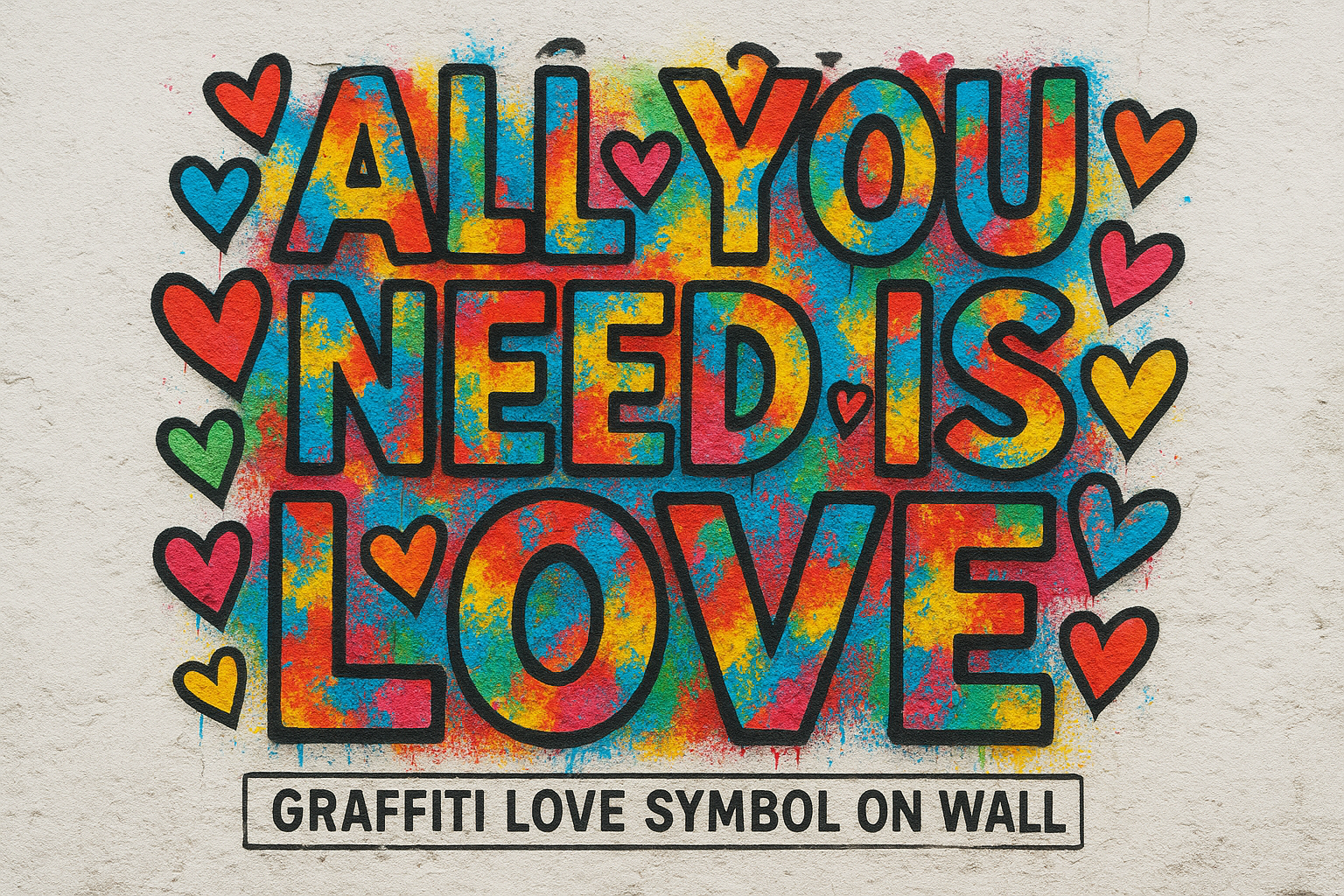 Vibrant graffiti art featuring the phrase 'All You Need Is Love' surrounded by colorful hearts, ideal for urban decor or social media inspiration.