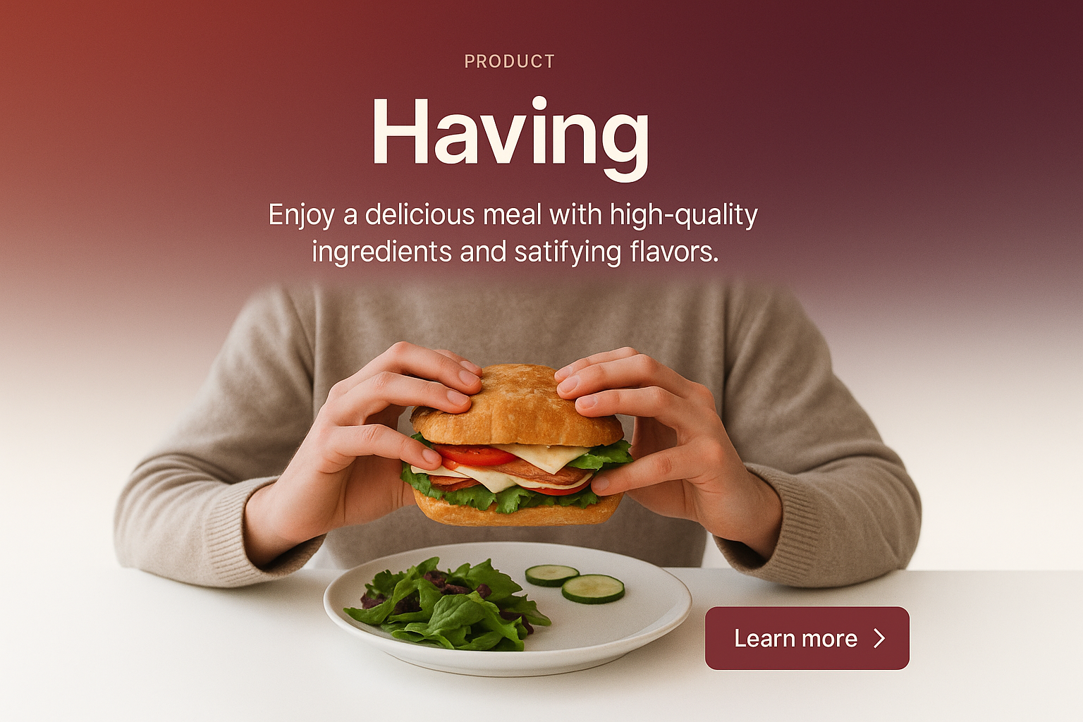 A visually appealing web design concept showcasing a person holding a burger, accompanied by a fresh salad. The background features a smooth gradient transitioning from dark to white, enhancing readability.